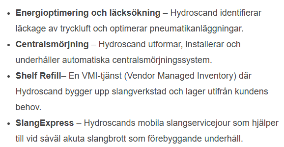 Hydroscand erbjuder också flertalet tjänster som hjälper till att förhindra driftstopp. Några av dessa tjänster är: