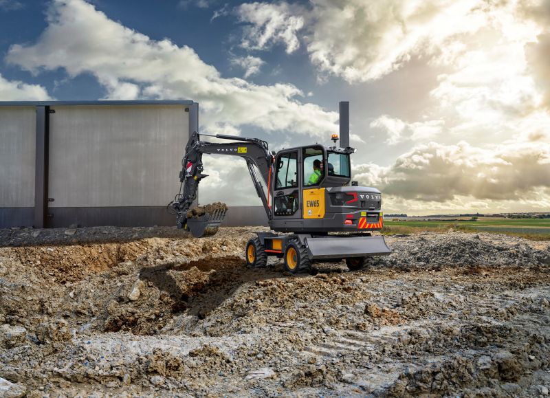 Den hjulburna EW65 kan köra i upp till 30 km/h, och lättvalda arbetslägen gör att föraren kan anpassa prestandan för körning, grävning eller stillastående arbete.