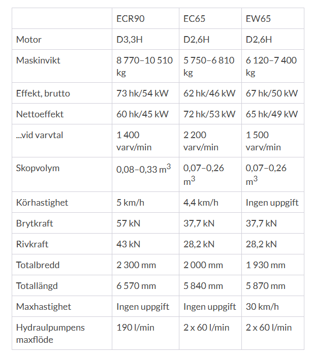 Nyckelspecifikationer Volvo ECR90, EC65 och EW65