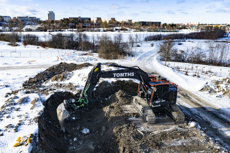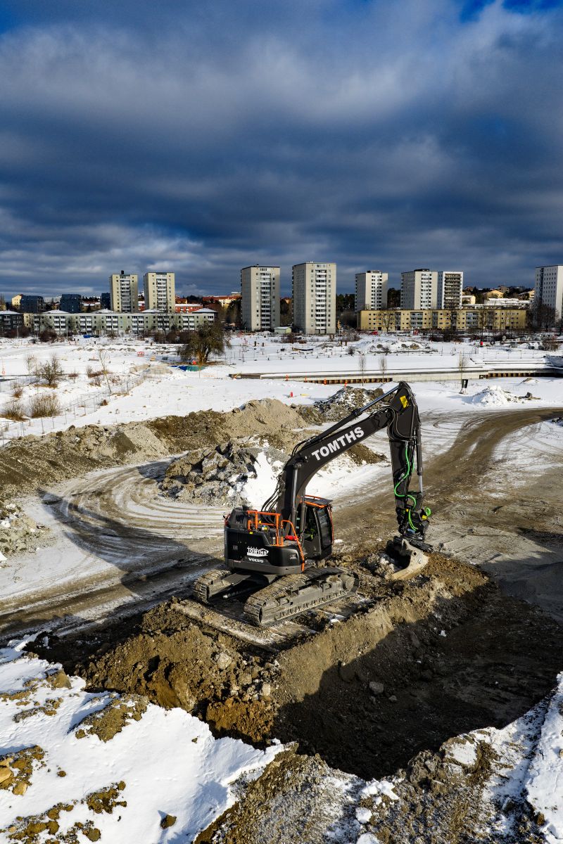 På Årstafältet utanför Stockholm gräver Micke Björk vatten och avlopp för en ny stadsdel med cirka 8 000 planerade bostäder med byggstart nästa år. I slutet av januari fick Micke byta sin gamla 30-tonnare mot den nya Volvo ECR355E High & Wide på närmare 40 ton.